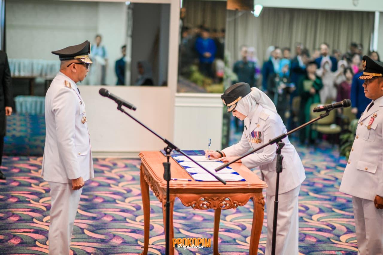 Setelah itu, acara dilanjutkan dengan prosesi serah terima jabatan dari Bupati sebelumnya Dr. Ir. H. Dendi Ramadhona K., S. T.,M.Tr.I.P kepada Bupati terpilih Hj. Nanda Indra Bastian,S.E.,M.M.