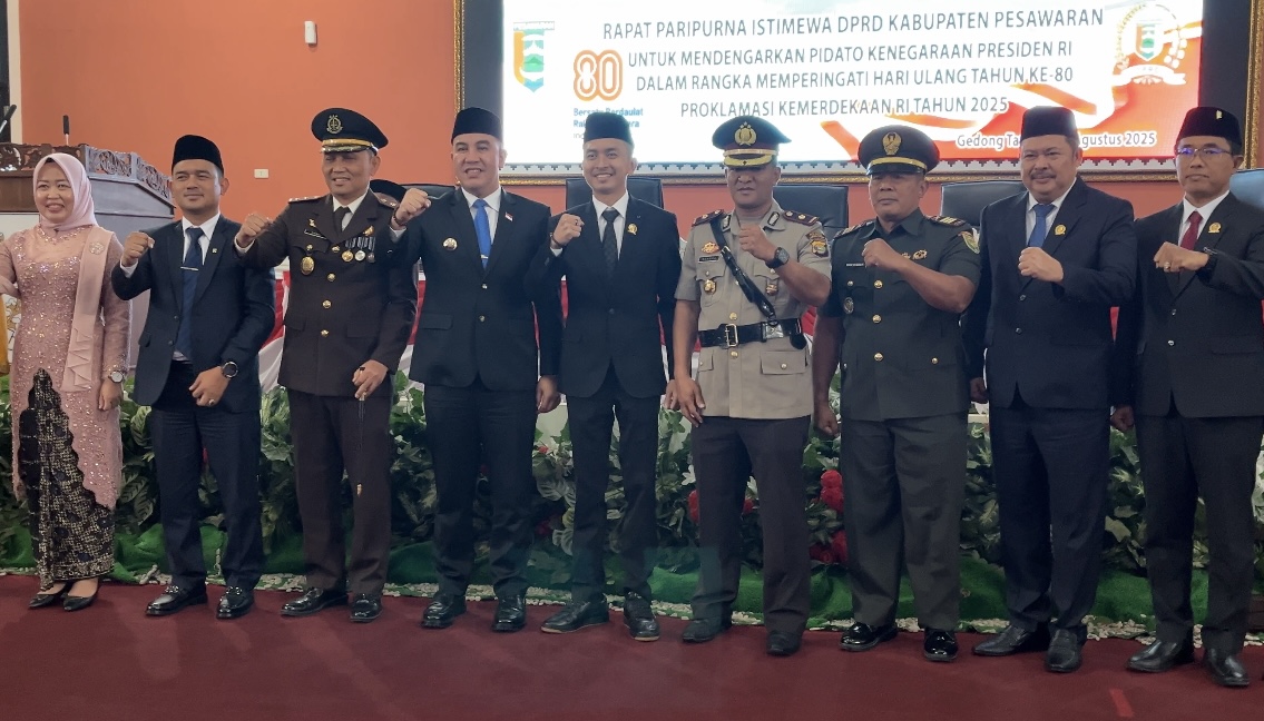 PESAWARAN – Dewan Perwakilan Rakyat Daerah (DPRD) Kabupaten Pesawaran melaksanakan Rapat Paripurna Istimewa untuk mendengarkan pidato kenegaraan Presiden RI Prabowo Subianto dalam rangka HUT RI ke-80 secara daring di Ruang Sidang DPRD Pesawaran, Jumat 15 Agustus 2025.