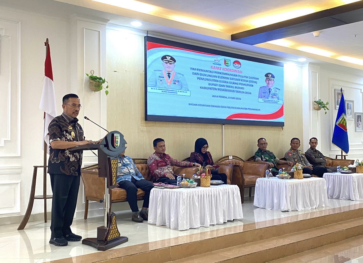Rakor ini bertujuan untuk memastikan seluruh tahapan PSU berjalan aman, tertib, dan sesuai regulasi. Kegiatan tersebut dihadiri oleh Sekretaris Daerah Kabupaten Pesawaran Wildan yang mewakili Bupati Pesawaran, unsur Forkopimda seperti Dandim 0421/Lamsel yang diwakili Pabung Pesawaran, Komisi III DPRD Pesawaran Evi Susina, Kasi Intel Kejaksaan Negeri Fuad Alfano Adi Chandra, Ketua Pengadilan Negeri Gedong Tataan Nugraha Medica Prakasa, serta jajaran kepala perangkat daerah, kepala bagian, dan camat se-Kabupaten Pesawaran.